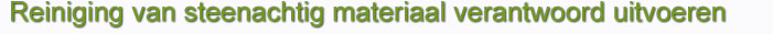 In ons advies aan de opdrachtgever maken wij onderscheid in de toe te passen reinigingmethodiek voor steenachtige materialen. Bijvoorbeeld reiniging met de hand met behulp van weinig lauw water en een puur mineraal reinigingsmiddel en met behulp van een zachte handborstel of reiniging met een daartoe geschikte zachte borstel in droge toestand of met behulp van bijzonder lage persluchtdruk en mineraal zand.